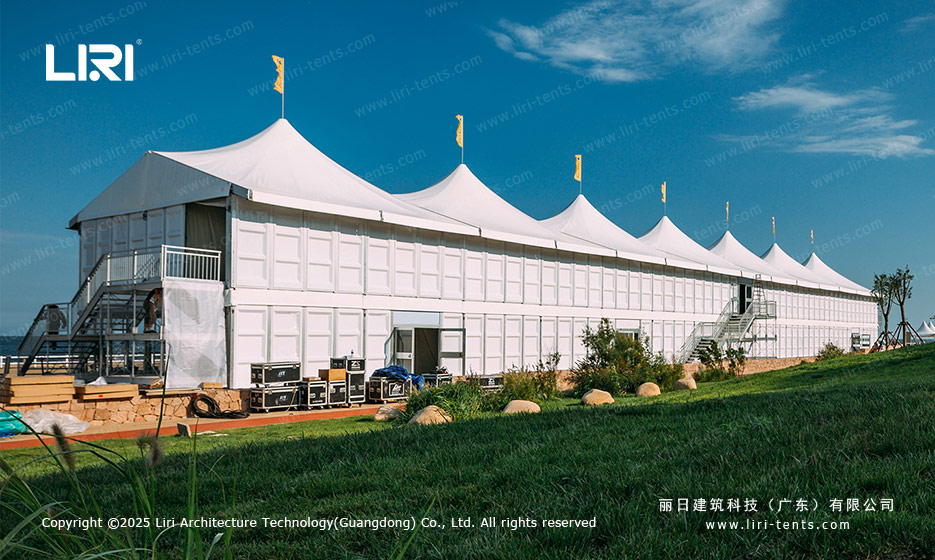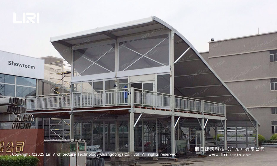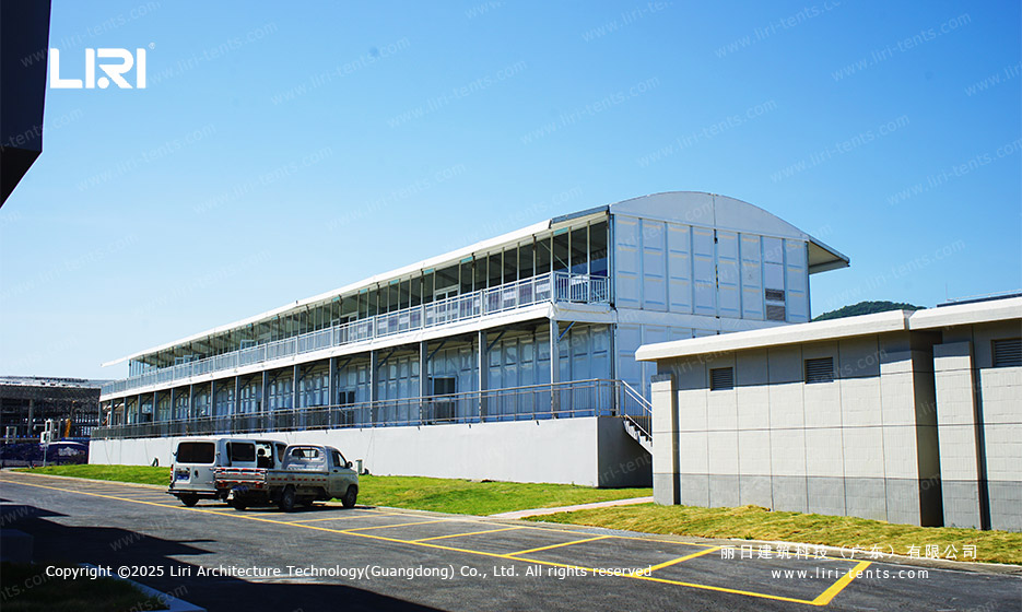 在各类大型商展与体育赛事中,如何高效利用场地资源、提升参与者体验,已成为主办方关注的核心问题。双层篷房因其结构灵活、空间利用率高、外观创意十足等优势,逐渐成为活动空间规划的理想选择。丽日建筑科技结合多年项目实践,推出五款兼具功能性与美感的双层篷房设计方案,包括尖顶、弧顶、人字顶、单坡弧顶和平顶气膜篷房,助力打造独特活动空间。