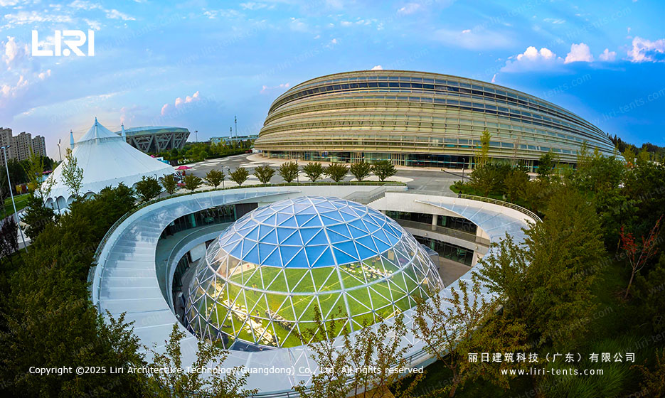 赛训基地的三座赛训场馆各具特色。其中,核心场馆“熊猫眼”是一座直径近35米的球形赛训场馆篷房,独特的设计极具视觉冲击力。另外两座分别是1800平方米与1000平方米的弧顶赛训场馆篷房。赛训篷房的框架采用高强度材料,硬度高、韧性好,能够轻松抵御10级以上台风的侵袭,为赛事训练提供了稳定可靠的环境。同时,篷房内部配置了先进的智能监测设备,可精准控制赛训场馆内的温度与湿度,确保无论外界环境如何变化,都能为参赛选手和机器人提供最适宜的比赛和训练条件,为赛事训练的顺利进行保驾护航。