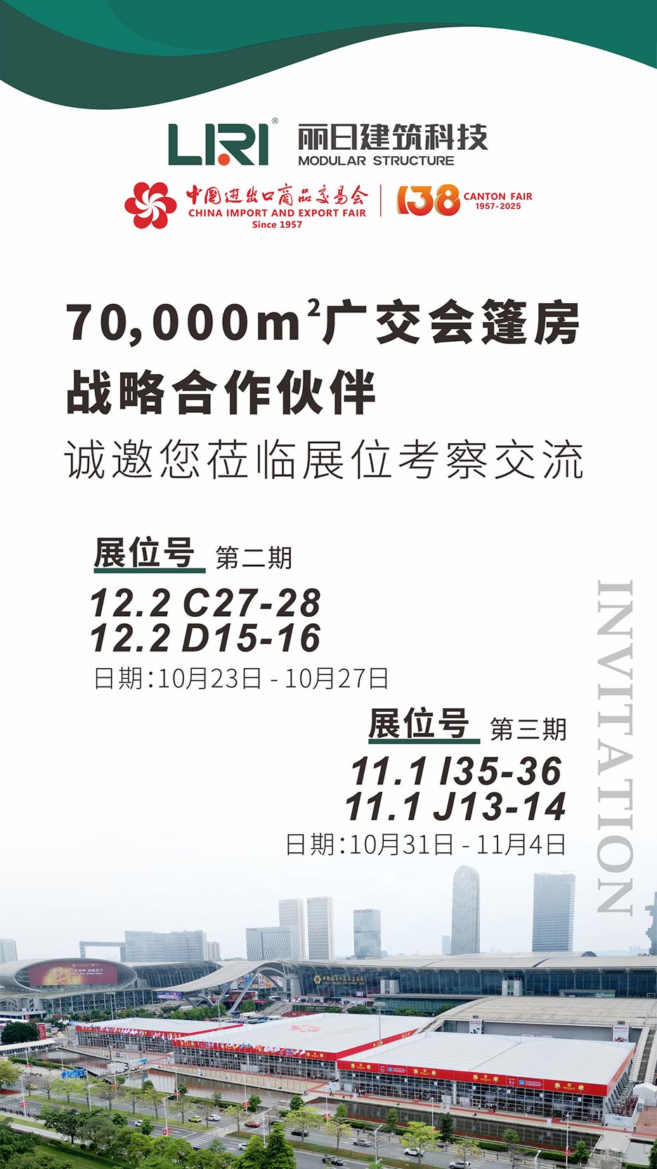 第 138 届中国进出口商品交易会(以下简称“广交会”)于 10 月 15 日盛大启幕,丽日建筑科技(广东)有限公司(以下简称“丽日”)已携手走过 24 载,丽日继续为广交会提供超70000平方米的临时建筑。