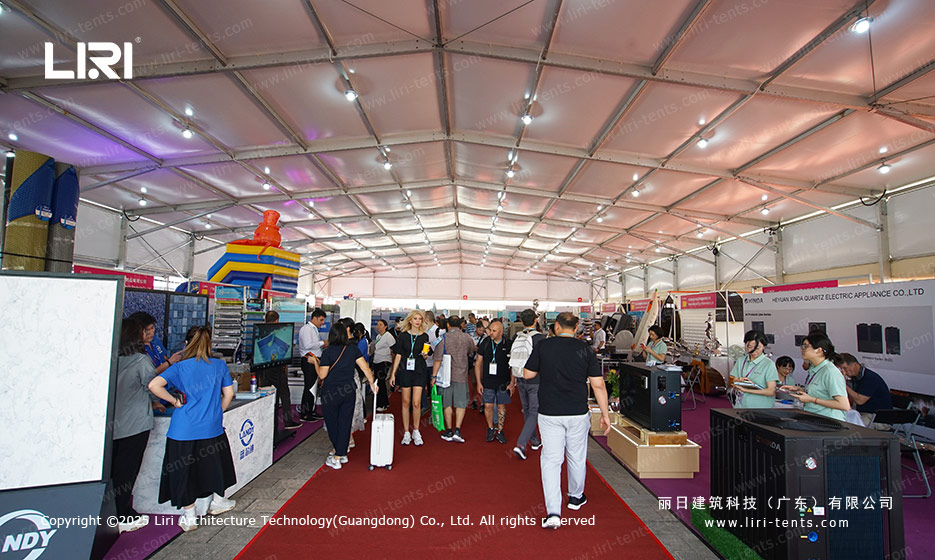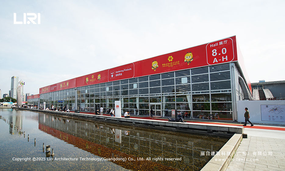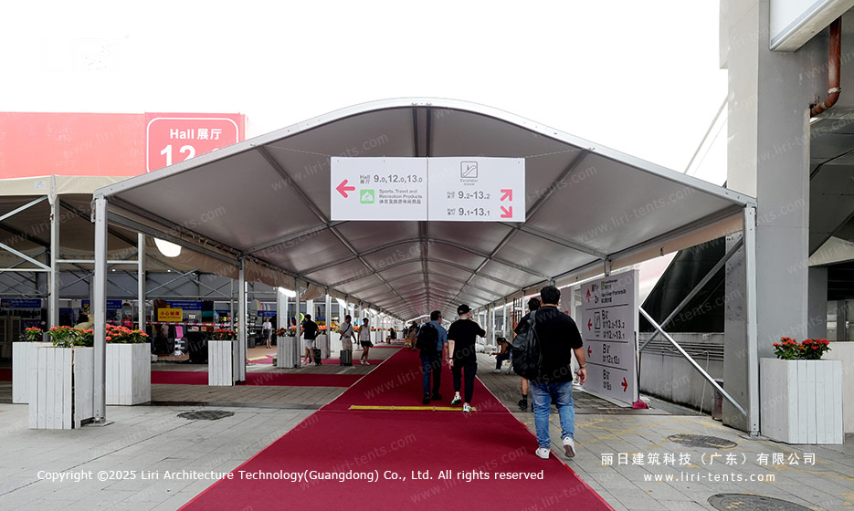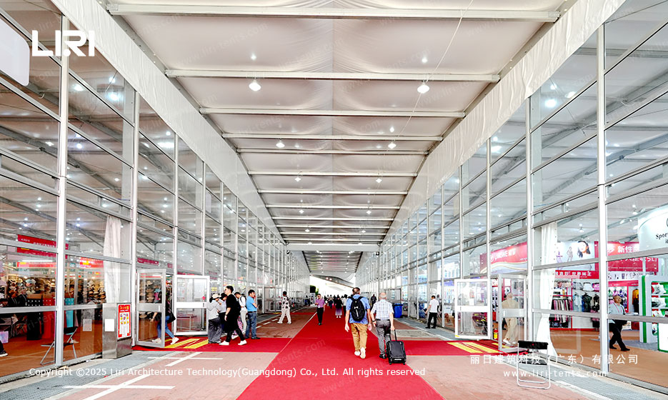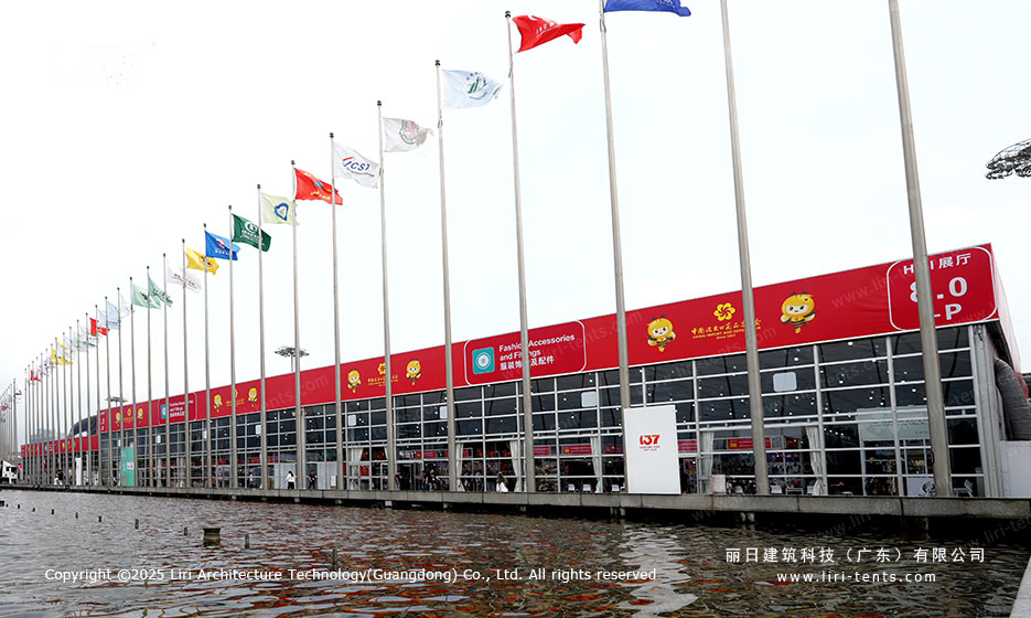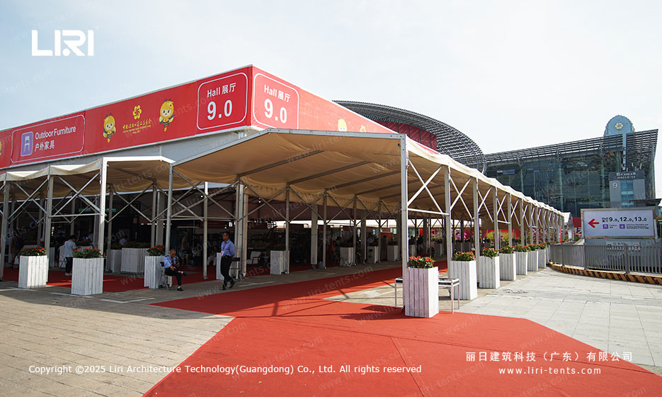 丽日拥有丰富的广交会合作经验,其强大的研发能力与创新的生产技术赢得了举办方的高度认可。本届再度为广交会提供包括展馆、办证中心、安检区等在内的铝合金篷房与配套设施。篷房采用模块化设计,具有快速组装和循环利用的优势,充分满足广交会高效、灵活的布展需求。