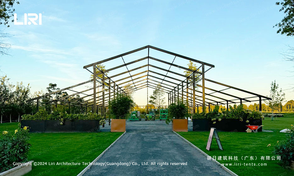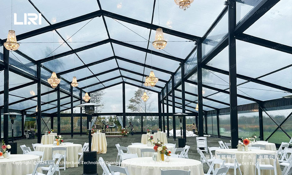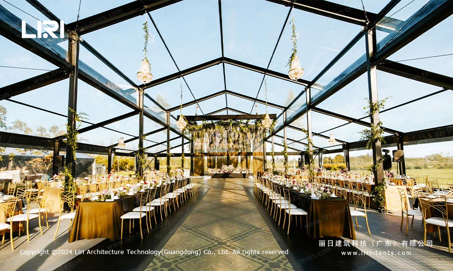 户外宴会厅的迷人之处在于其与自然景观的完美融合,而橘园帐篷正具备这一独特优势。其设计灵感源自欧洲中世纪的复古风格,线条优雅流畅,尽显高贵典雅。帐篷幕墙采用全透明玻璃材质,视野通透无遮挡,为每一场户外活动营造出独一无二的氛围,彰显别具一格的场地特色。