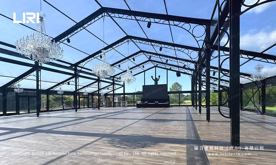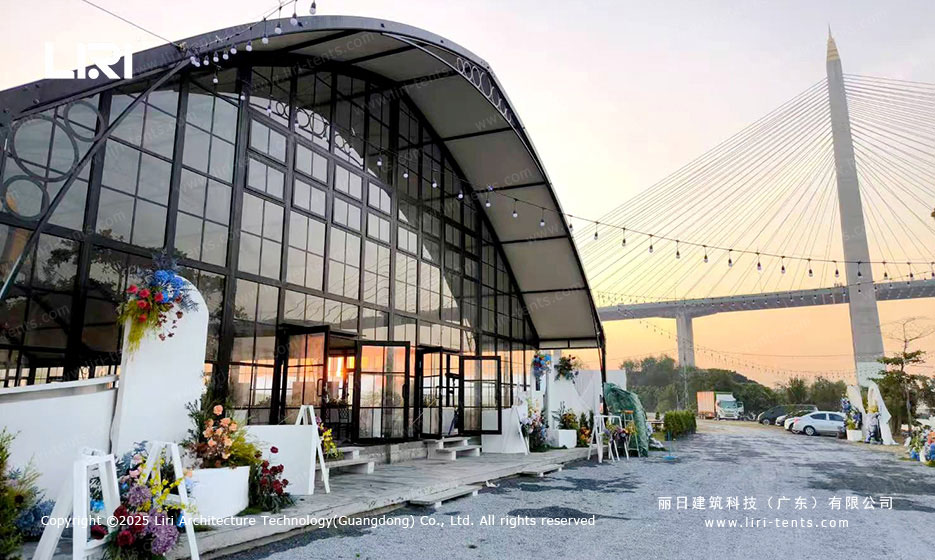 玻璃材质:透明的幕墙玻璃能让自然光充分洒入篷房内部,营造出温馨浪漫的活动氛围。
