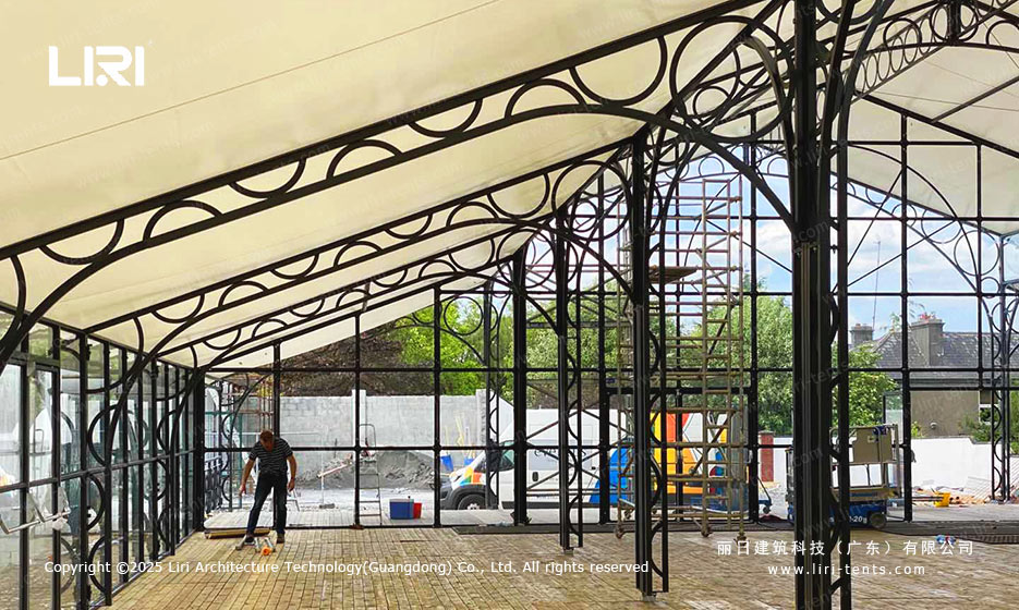 为了满足大跨度空间的需求,中庭篷房的框架通常采用高强度铝合金。铝合金具有优异的承重能力,同时具备轻质、耐腐蚀等特点,使篷房的搭建和拆卸过程更加高效便捷。而铁艺则是另一种经济实惠且可靠的选择。凭借其坚固耐用的特性,铁艺为篷房提供了稳定的支撑,能够满足多种场景的需求。