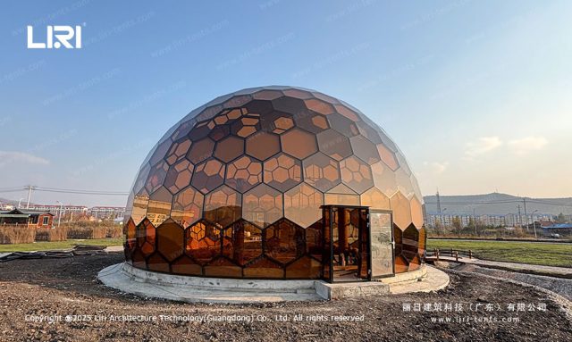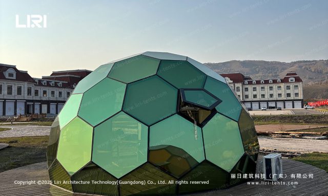 秉承“自然共生”的设计理念,墨轩居玻璃星空房采用钢化玻璃打造流线型球体结构,营造沉浸式的户外居住体验。其360°全景视野结合5-15米灵活直径设计,适配山野、湖畔、沙漠等多种场景。白天,这是一颗景区内熠熠生辉的“水晶球”;夜晚,则化身为旅客的专属观星站。
